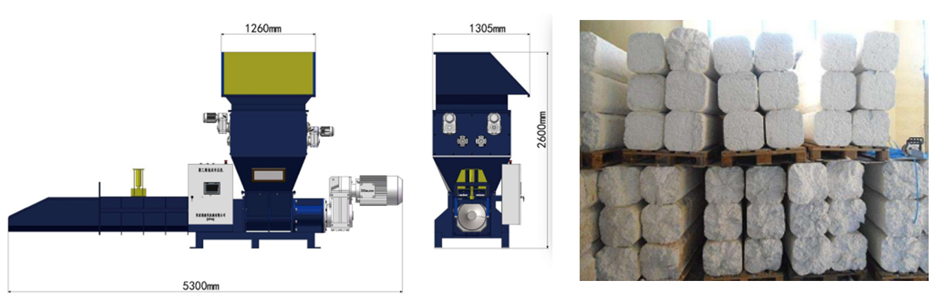 首先通過破碎機和壓縮機上的濾網使料的體積變小,然后這些料會落到螺桿上,主電機會通過螺桿把料向前推送,與此同時模頭的液壓系統關閉來壓縮EPS泡沫料,這些料會變成塊狀,體積相應地減少了30到50倍,也更易于攜帶和運輸。機器的所有部件都由一臺機器組成,節省了成本、能量損耗和空間。這些EPS泡沫款可以再次破碎成更小的體積。