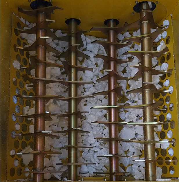 CF-HM400型號的熱熔機采用四軸破碎刀片、四排平行的刀片軸對稱地固定在刀片上,刀片在雙軸刀片軸上錯位排列,各軸上的刀片通過計算的方法均勻地布置在同一方向。每一軸上的第一個刀片和最后一個刀片都成90度角。當四軸破碎刀片開始工作時,兩個平行的刀片軸以不同的旋轉方向進行旋轉,形成一個波浪的控制,這樣材料就可以恒定的速度向下移動,在經過切割刀片的切割后,會變成更小的塊狀。EPS熱熔機里的四軸破碎刀片可以把EPS料變成更小體積的塊,然后通過濾網。這些不能通過濾網再次被破碎的料會最終通過濾網過濾掉。該材料將由高速旋轉螺桿推送到加熱筒。主機的螺桿可以輸送、加熱料,使其達到熱熔狀態(tài),然后擠出并通過液壓切刀將其切成一塊一塊的,更加便于貯存和運輸。
